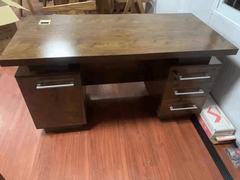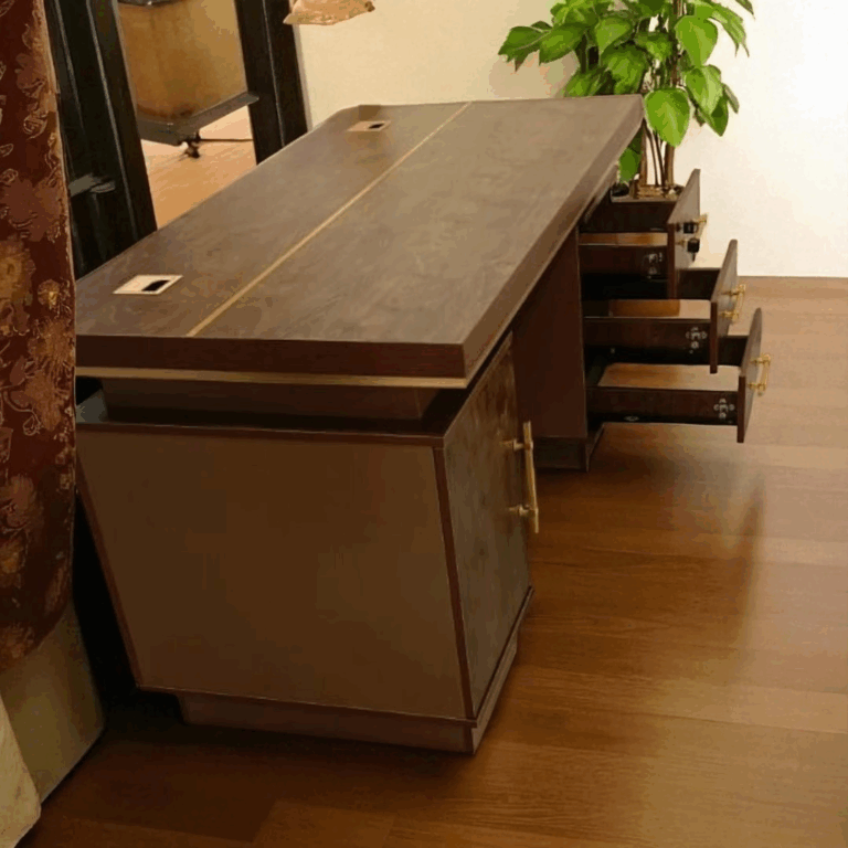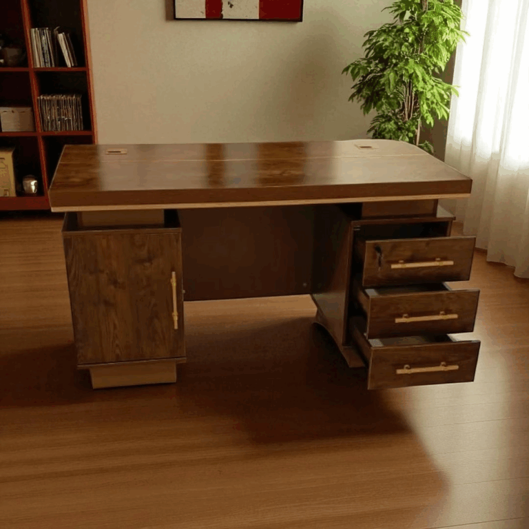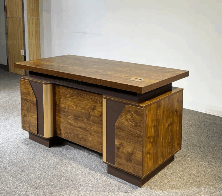 Built from high-quality MDF or engineered wood, it features a refined surface finish—available in premium tones like walnut, mahogany, or oak—that adds a touch of sophistication to any office. The broad desktop provides ample space for documents, computers, and décor, while integrated drawers and side cabinets offer practical storage for files and office essentials. The strong, stable frame ensures durability, and the sleek modern design enhances the overall appeal of executive workspaces.